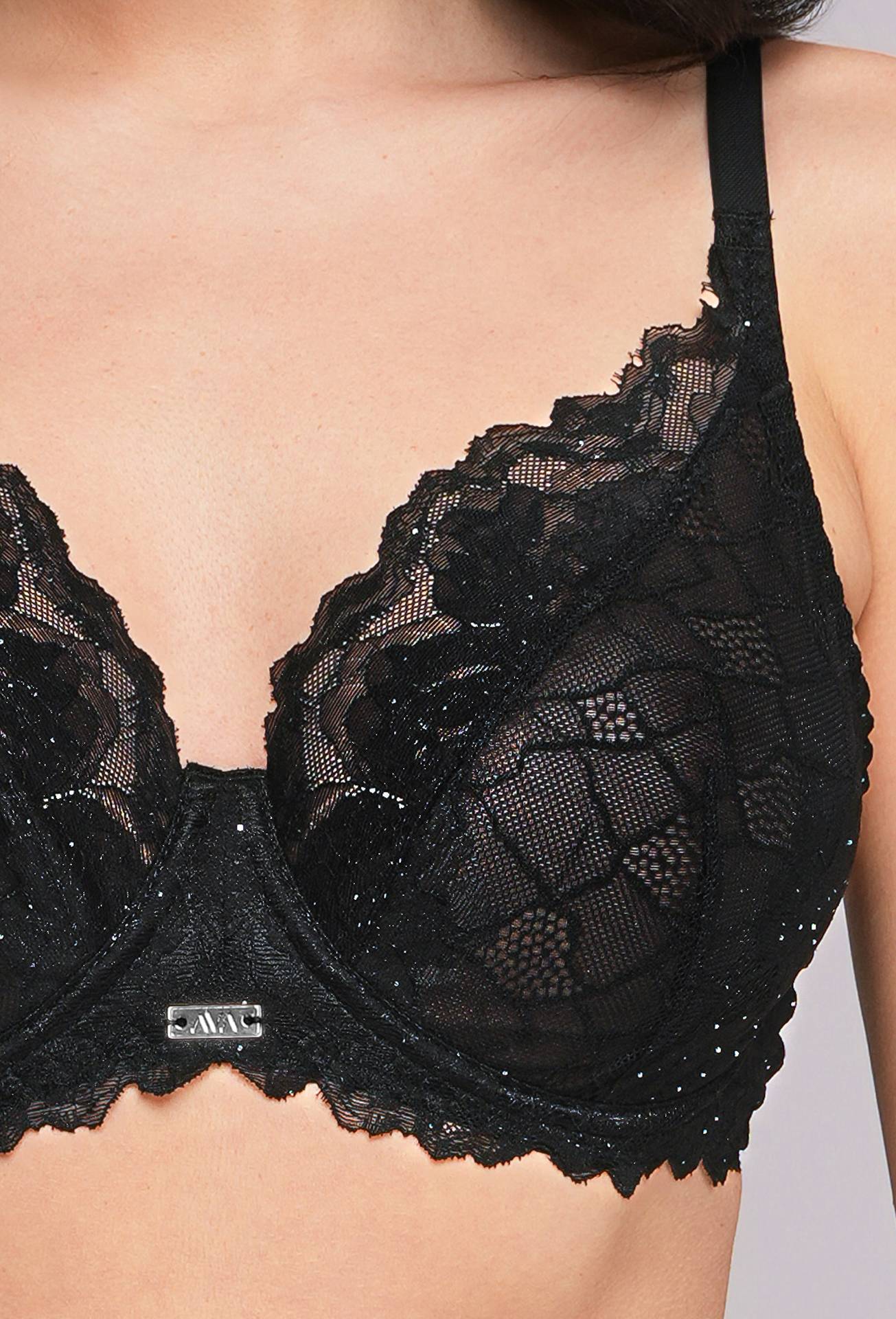 This sensual soft bra is made of delicate lace with a floral pattern and a touch of sparkle. The cups beautifully gather and emphasize the natural shape of the breasts, while ensuring lightness and comfort. The underwire construction provides stable support for the bust, and the adjustable straps allow for a perfect fit. A subtle decoration between the cups emphasizes its elegant character. AV 2253 black is the perfect choice for women who value a combination of femininity and comfort.