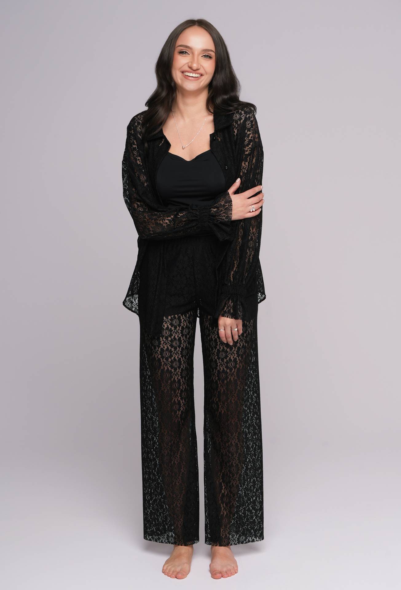 The set includes a lace shirt with a light, airy cut and stylish, wide-leg pants, which together create a perfect harmony of elegance and comfort.