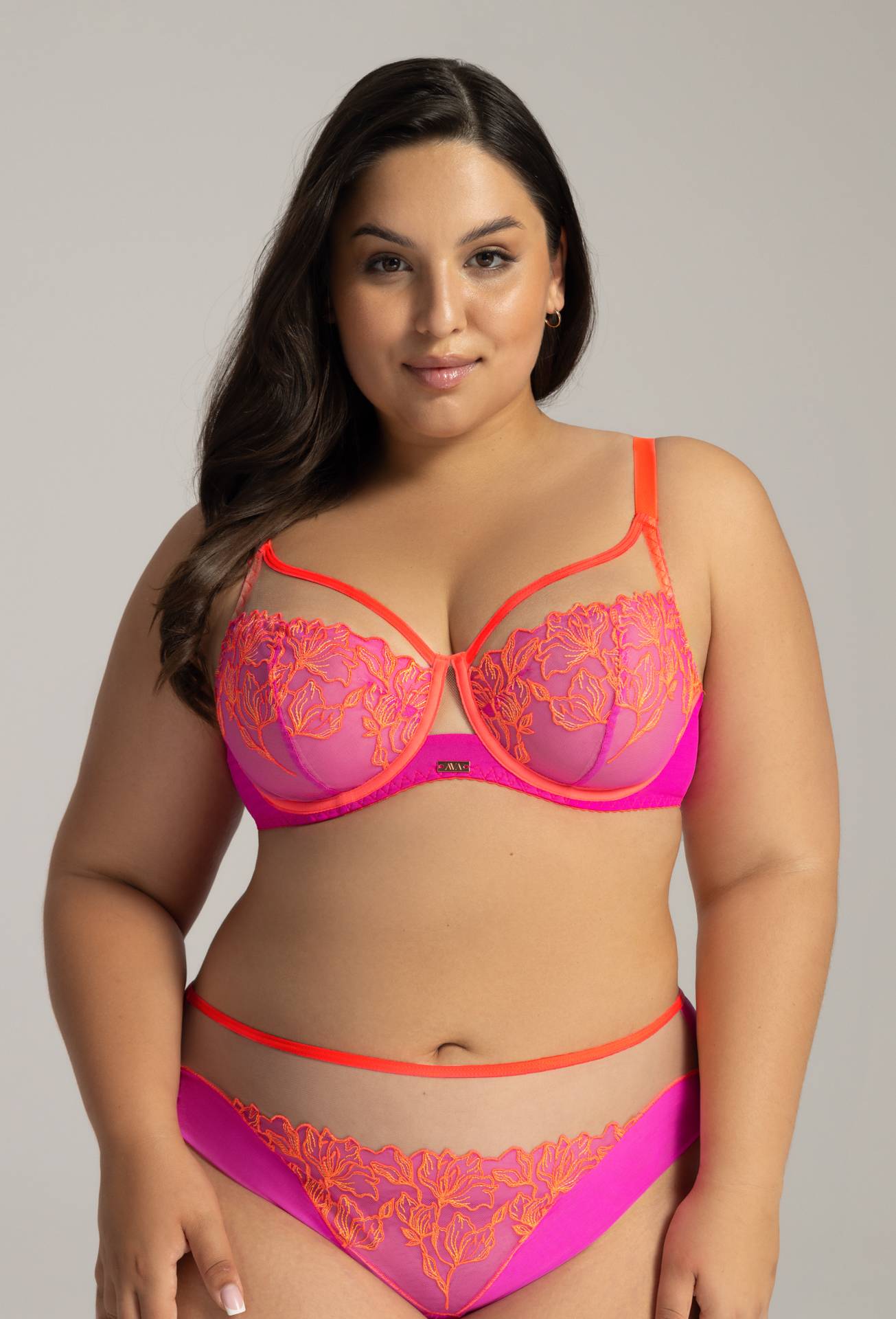 Neons do not go out of fashion! AV 2162 in vivid pink is sure to capture your heart. The soft cup formula shapes the breasts freely, while supporting and beautifully displaying them in the cleavage. Rich floral embroidery in intense colors runs up the breasts, subtly covering them. Orange piping, tunnels and straps, along with a fuchsia-colored perimeter, not only stabilize the bra, but also add a feisty touch. The flirtatious transparencies in the upper parts of the cups and the artful bottoms and bras create room for imagination - go bold!
