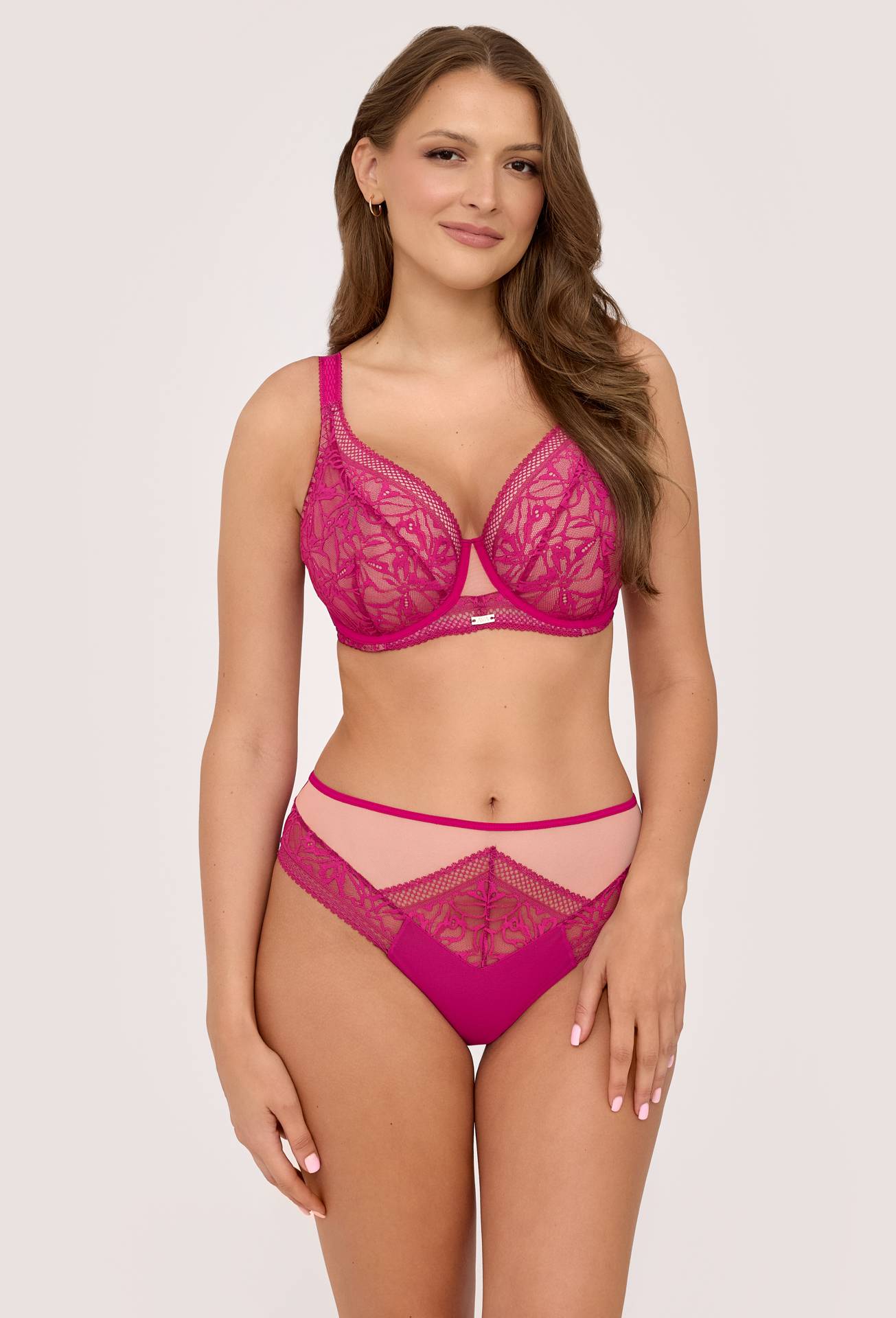 The AV 2220 briefs in fuchsia are a unique blend of vibrant color and feminine elegance. Crafted from soft, semi-transparent mesh in a subtle nude shade, they contrast beautifully with the bold, fuchsia lace featuring a floral pattern.