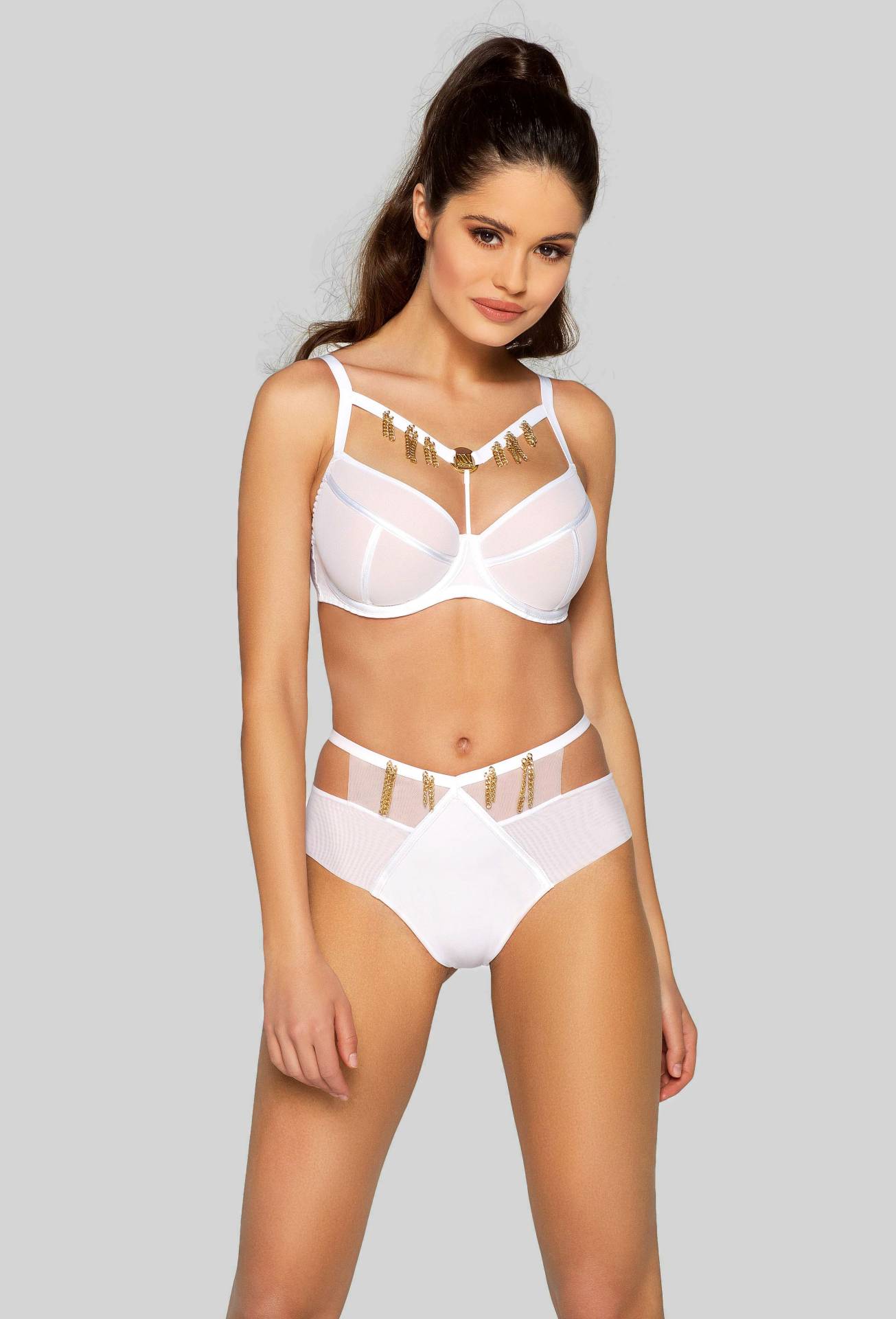 The sensual Pure Poison set in white inspires the imagination and encourages you to cross boundaries. The push-up bra, refined in every detail, will emphasize the feminine curves, while the luxurious fabrics and extraordinary appliques will adorn the cleavage like exclusive jewelry. The soft beige foam filling the cups will comfortably support the bust covered with delicately transparent tulle, and the satin hems of the edges and tunnels will illuminate the snowy white with a seductive glow. Fancy briefs and high-waisted Brazilian panties with an ambiguous design complement this sexy set perfectly.