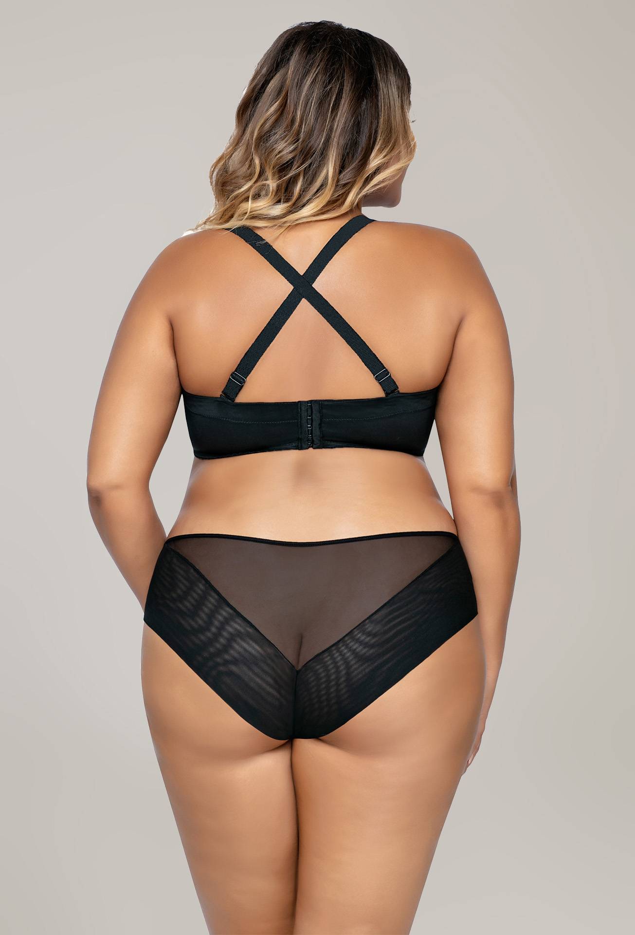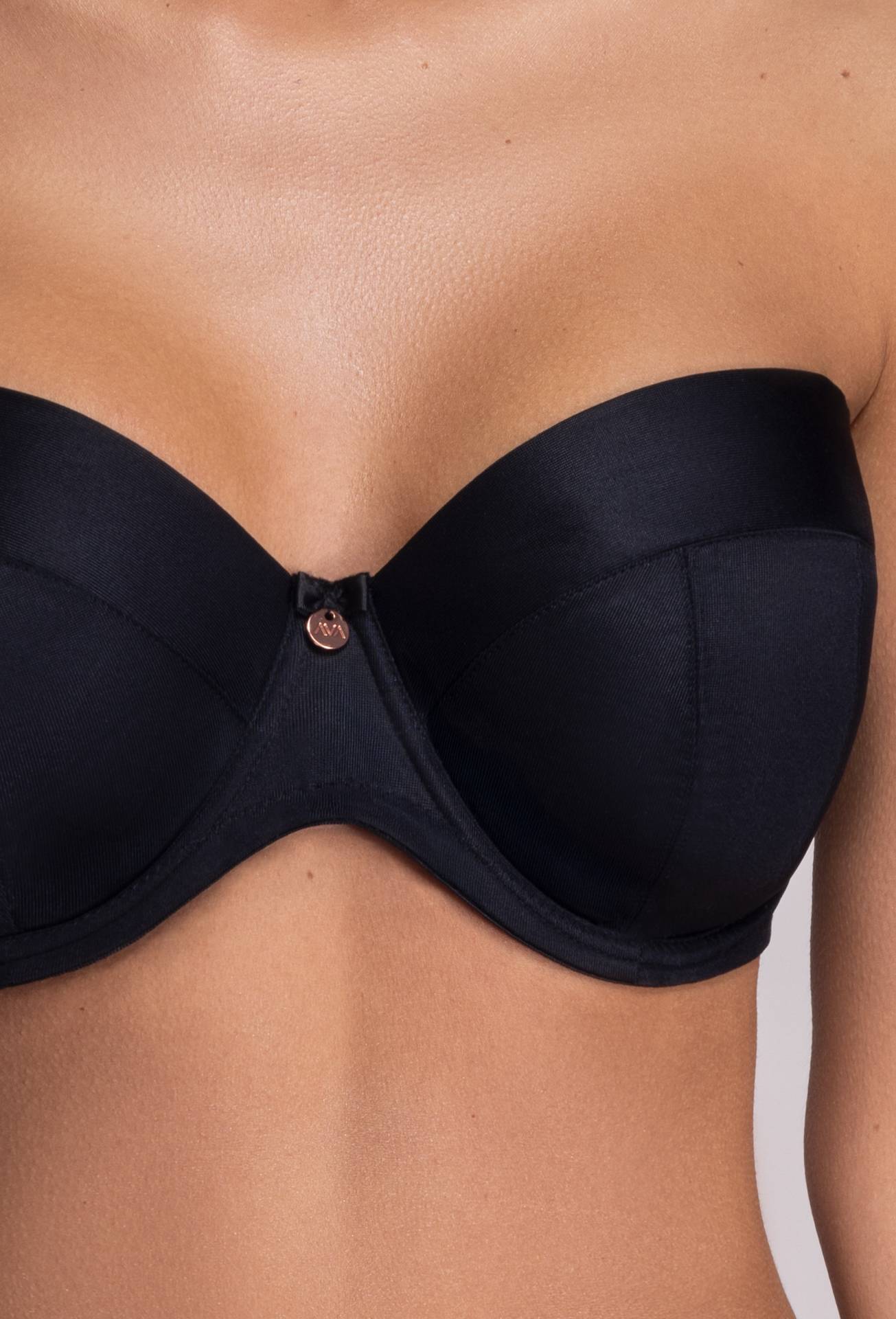 Exceptional lingerie for a special day. An elegant and extremely sensual bardot in black. Cut that allows to expose the upper part of the cleavage, raises the breasts, optically enlarging them. Sides and cups of the model are entirely covered with subtle, smooth knitwear. Decorative jewellery element at the seam. The bra has silicone straps on the inside so it can be worn strapless.