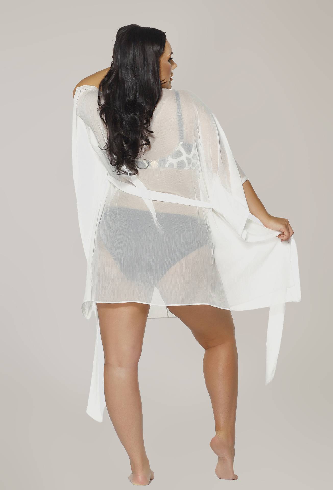 A short flowy cover-up is a versatile piece for summer styling. Pareo 024 will not only protect your skin from excessive sun exposure, but will also prove a stylish accessory. The white, delicately transparent chiffon cape enriched at the neckline with a gold lurex ribbon is an eye-catcher, and its unique, multifunctional cut meets all expectations.