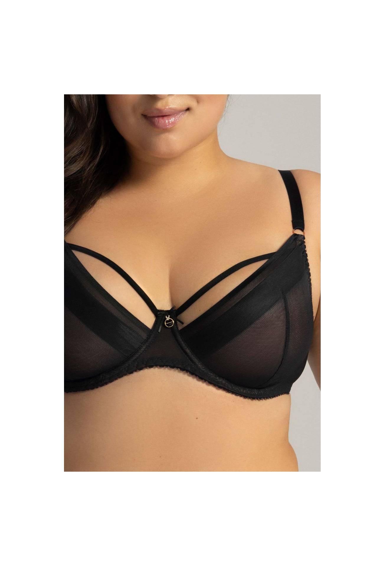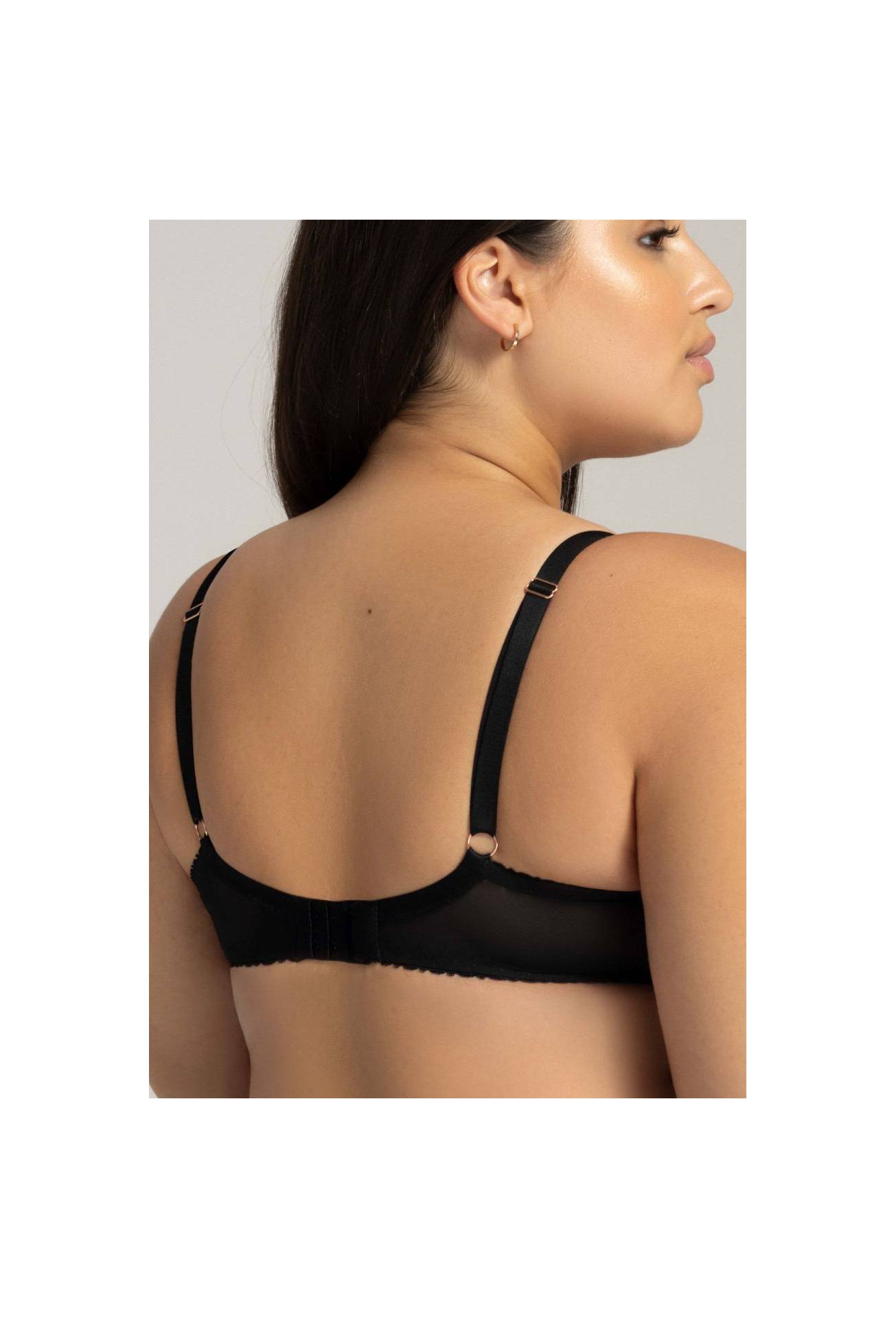 The long-awaited realization of the vision of a soft bra whose charm is encapsulated in its simplicity has become a reality! The stylish AV 1824/4 is a dream come true of maximum comfort dressed in feminine elegance. Lined with marquise and tulle, the bowls made of springy, delicately transparent pleated fabric softly embrace the breasts, gathering them towards each other. Black straps in two widths decorating the bra, along with the piping peeking out from underneath, add charm and girlish allure, and a gold crystal pendant placed at the junction of the breasts brightens up the deep black.
