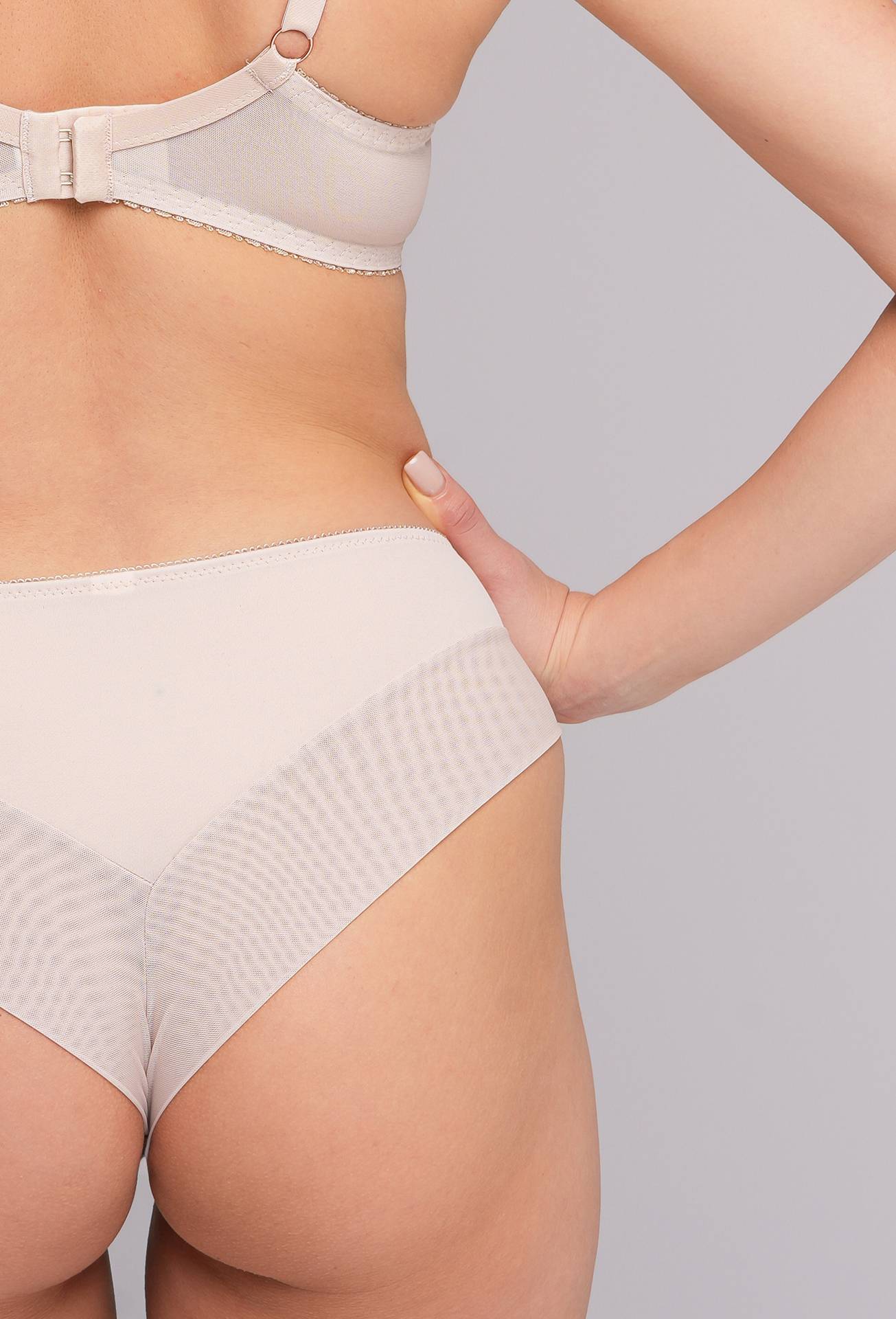 Brazyliany AV 2256/B Beige to połączenie zmysłowego kroju z delikatną stylistyką. Przód ozdobiono filigranową koronką, a tył wykonano z miękkiej tkaniny dopasowującej się do sylwetki. Model subtelnie podkreśla pośladki, nie tracąc jednocześnie na wygodzie.