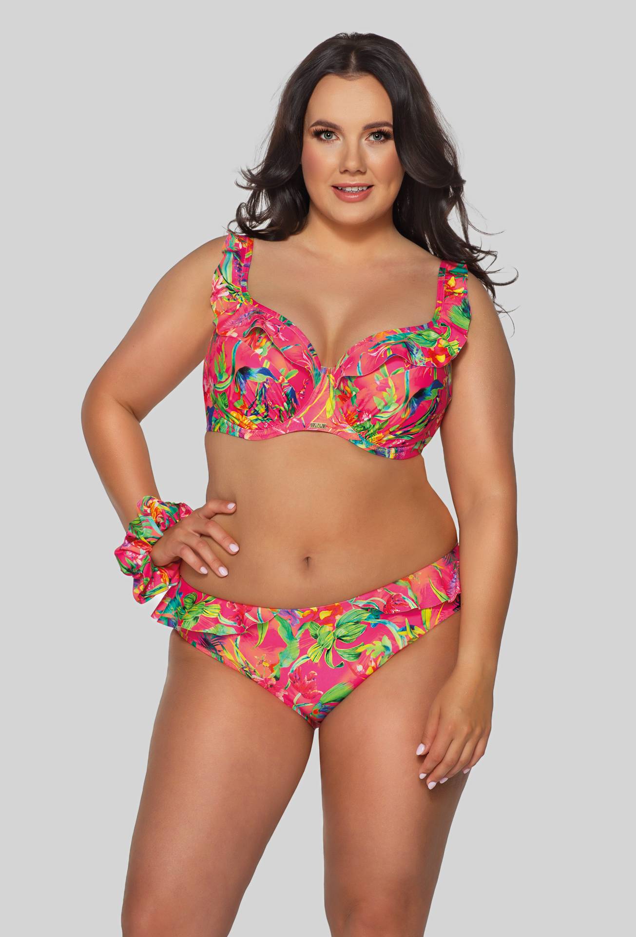 SK 192 ma w sobie mnóstwo dziewczęcego uroku. Miękkie miseczki z delikatnym drapowaniem od spodu kształtują piersi, stabilnie je podtrzymując, a czarujące falbanki zalotnie okalają dekolt, sprytnie ukrywając ewentualne dysproporcje. Brazyliany SF 192/11/B z falbankami na biodrach dopełniają całości, a pokrywający całość kolorowy, kwiatowy print przyciąga wzrok i przywodzi uśmiech na twarz.