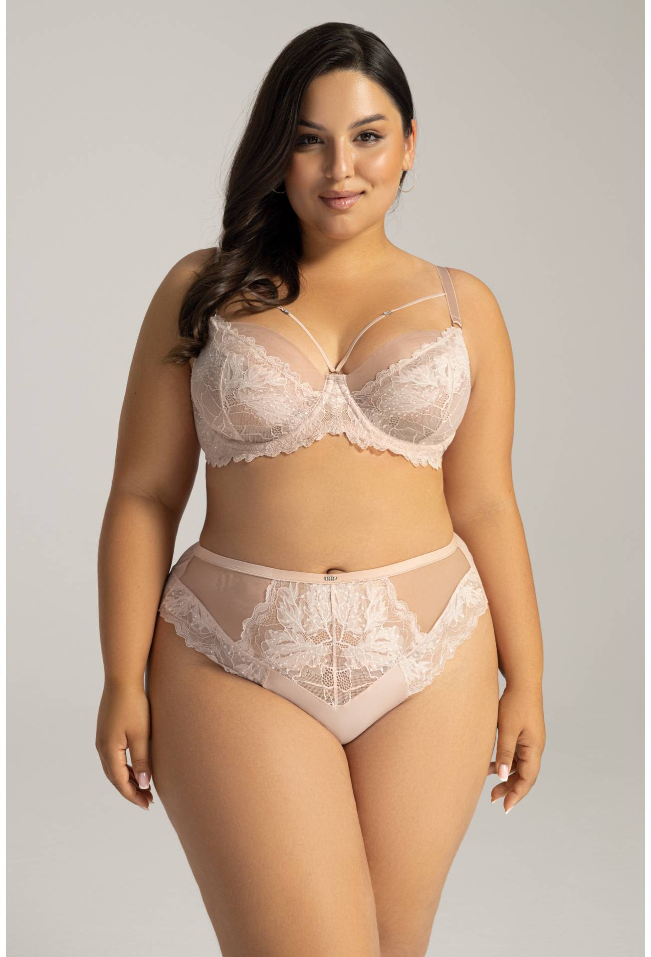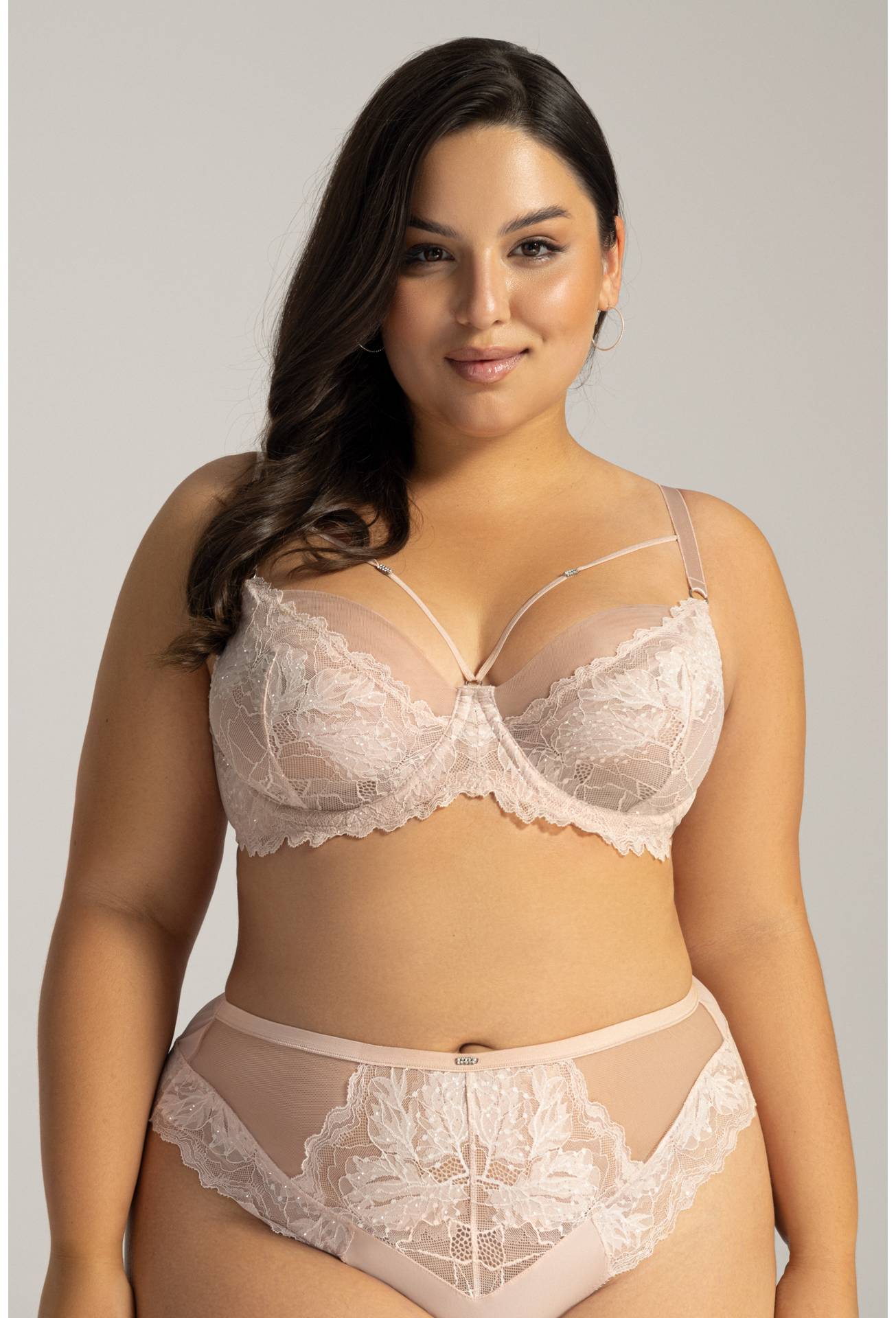 Urokliwa Fiesta to bieliźniany majstersztyk! Miękkie miseczki wykonane z połączenia markizety i tiulu pokryte zostały misternie tkaną koronką, skrząca się srebrnym błyskiem. Nietuzinkowy odcień różu dodaje modelowi delikatności, a ozdobny bawet czyni model AV 2155 niezwykle romantycznym. Odpinane dekoracyjne paseczki dodatkowo podkreślają kobiece walory, a umieszczone na nich cyrkonie rozświetlają dekolt. Sprężyste ramiączka oraz szeroki obwód pozwolą na indywidualne dopasowanie, a komfortowe miseczki zbiorą i podtrzymają biust. Całość wraz z brazylianami tworzy wyjątkowy zestaw, na który zasługuje każda kobieta.