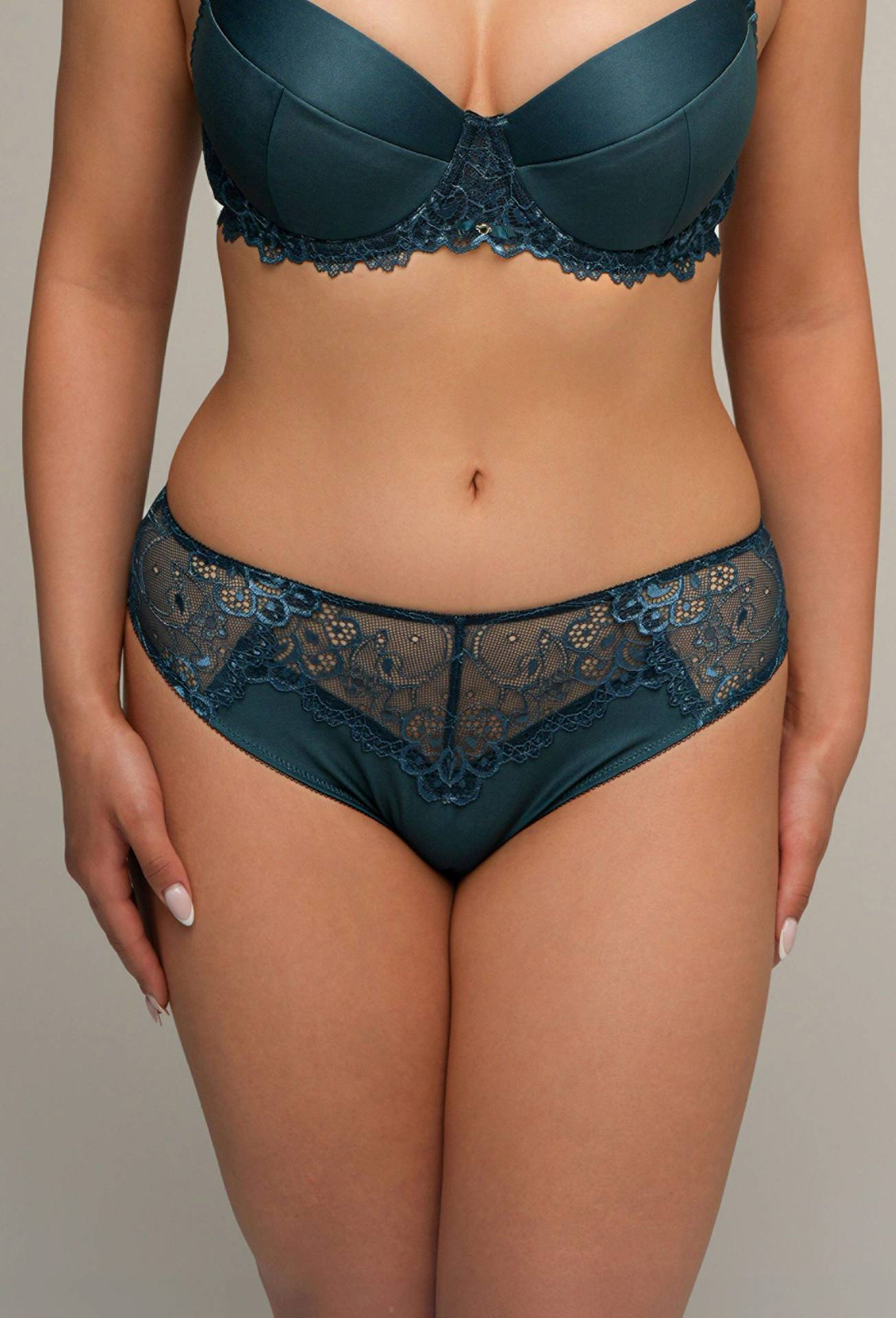 Figi AV 2201 to harmonijne połączenie elegancji i wygody. Przód wykonano z gładkiej tkaniny w szlachetnym odcieniu butelkowej zieleni, którą uzupełnia subtelna koronka o kwiatowym wzorze. Transparentne wstawki z siateczki dodają lekkości, a staranne wykończenie podkreśla luksusowy charakter modelu.